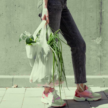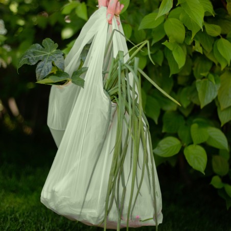 Биоразградимите и компостируеми транспортни чанти са перфектното решение за пазаруване. Произведени са от царевично нишесте и биополиестери с помощта на BioMateris. По този начин ние гарантираме постоянно качество и повишена устойчивост при транспортиране. Произведени в Румъния в нашата фабрика в Буфтя, използвайки технология за ниски емисии на въглерод. Предлагат се в три различни размери с обем и издръжливост от 2 кг до 7 кг. Чантите от царевично нишесте са в съответствие с EN13432 и са освободени от еко такса.