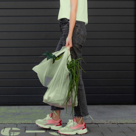 Биоразградимите и компостируеми транспортни чанти са перфектното решение за пазаруване. Произведени са от царевично нишесте и биополиестери с помощта на BioMateris. По този начин ние гарантираме постоянно качество и повишена устойчивост при транспортиране. Произведени в Румъния в нашата фабрика в Буфтя, използвайки технология за ниски емисии на въглерод. Предлагат се в три различни размери с обем и издръжливост от 2 кг до 7 кг. Чантите от царевично нишесте са в съответствие с EN13432 и са освободени от еко такса.