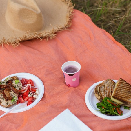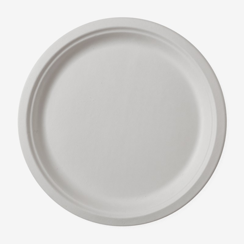 Кръгли чинии, изработени от влакна от захарна тръстика, траен материал при екстремни температури, устойчиви в хладилника или микровълновата печка. Издръжливи при температури до 120°C за ястия с олио и до 95° за ястия на базата на вода. Те са биоразградими и бързо компостируеми, дори и у дома в съответствие със стандарта EN13432.