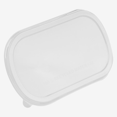 Прозрачният вариант на картонените или CPLA капаци, капаците rPET са подходящи за студени ястия (до 40° C), които изискват видимост. Без да въвеждаме нова пластмаса в производството, рециклираната пластмаса (rPET) представлява икономично решение с намалено въздействие върху околната среда. Съвместими с касероли от 800 ml. След употреба, те могат да бъдат събрани заедно с пластмасовите отпадъци, за да бъдат рециклирани.