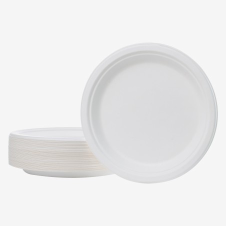 Fehér színű, cukornádból készült kerek tányérok, 22 cm, 50 db