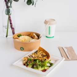 Farfurii patrate realizate din fibra de trestie de zahar de zahar, un material durabil la temperaturi extreme, rezistente in frigider sau cuptorul cu microunde. Rezista la temperaturi de pana la 120°C pentru preparatele cu ulei si pana la 95° pentru preparatele pe baza de apa. Sunt biodegradabile si compostabile rapid, chiar si la domiciliu conform standardului EN13432.